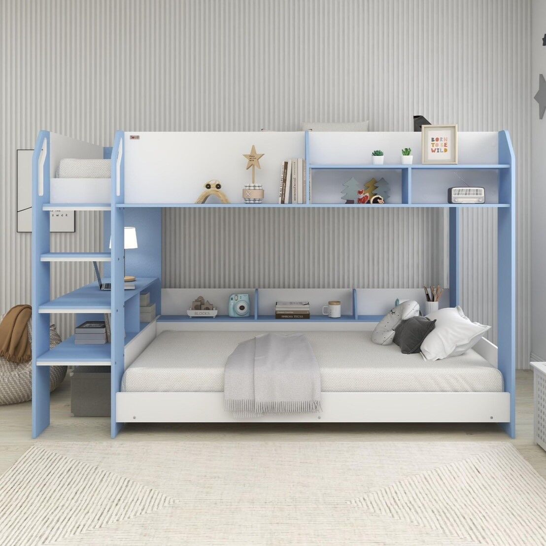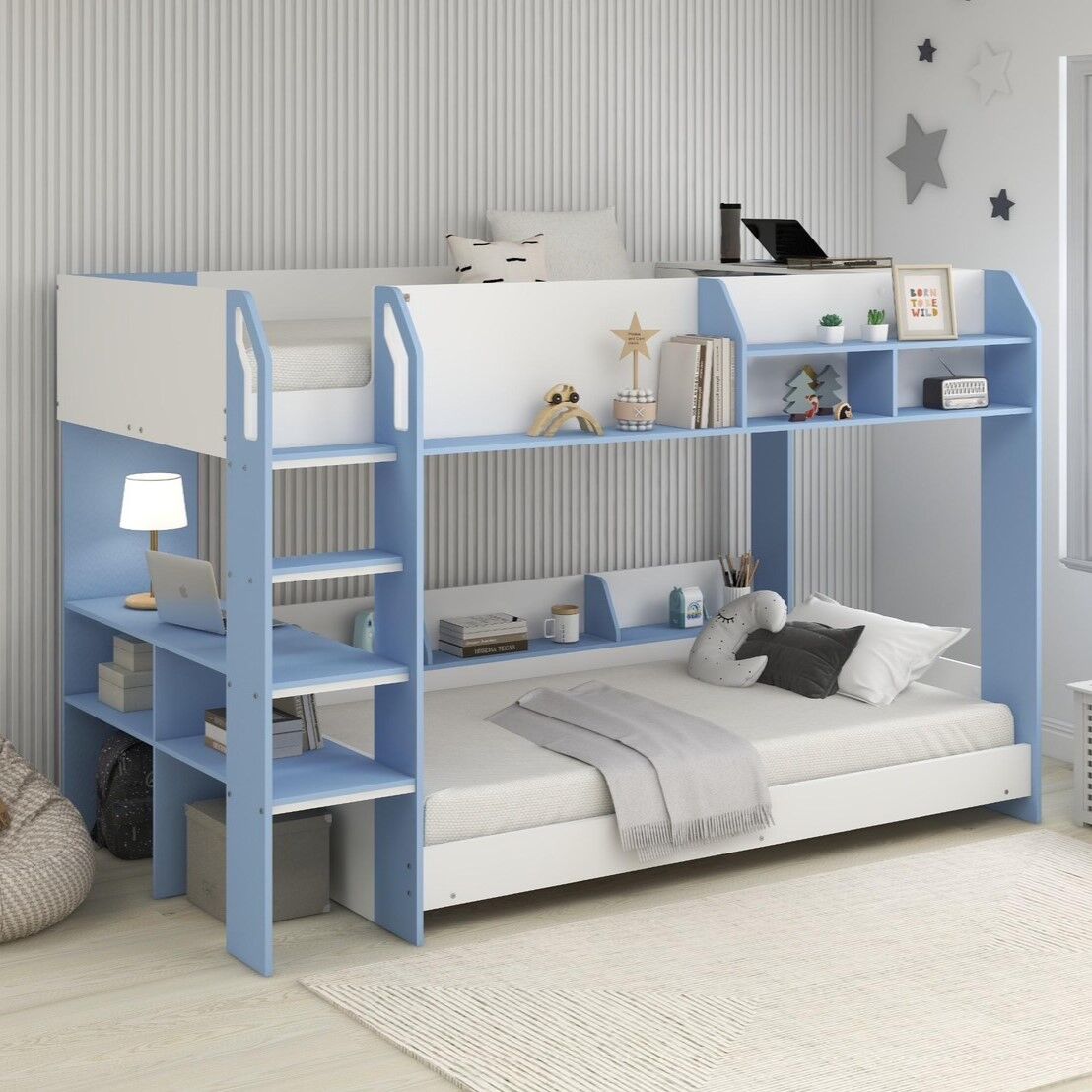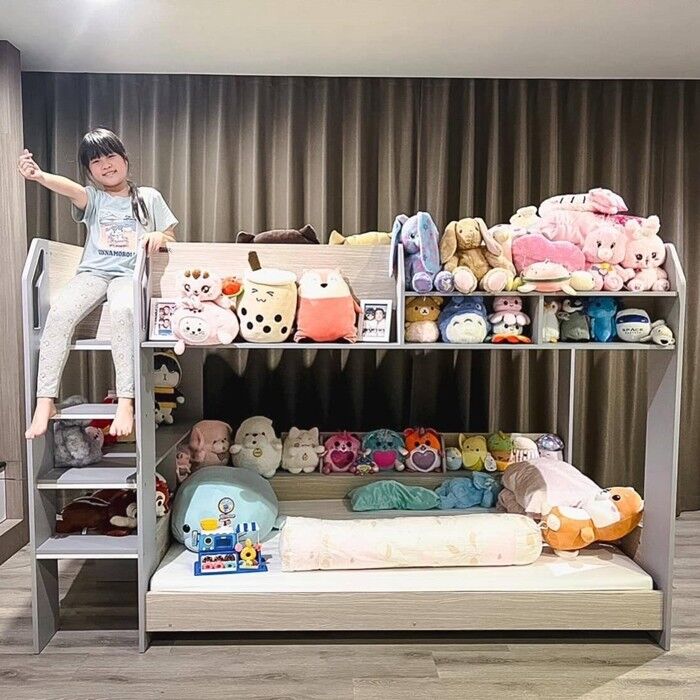 มีชั้นวางของไว้ตกแต่งเตียงหลายจุดทั้งชั้นบนและล่าง