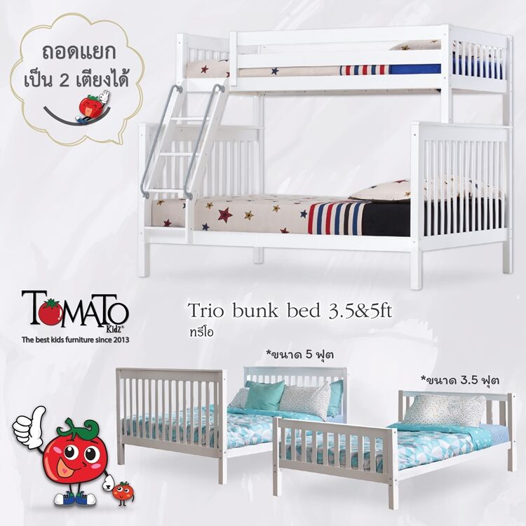 เตียงสองชั้นผู้ใหญ่ รุ่น Trio ที่นอนได้ตั้งแต่เด็กจนโต ที่จะช่วยให้พื้นที่ในห้องของคุณกว้างยิ่งขึ้น อีกทั้ง Design ที่เรียบง่ายไม่ว่าจะเป็นลูกผู้หญิงหรือผู้ชายก็ตกแต่งให้เข้ากับห้องนอนได้เป็นอย่างดีเตียงนอนราคาสุดคุ้มค่า ผลิตจากไม้จริงคงทนแข็งแรง ด้วยขนาดมาตรฐานชั้นบน3.5ฟุต และชั้นล่าง 5ฟุต จึงสามารถนอนได้ตั้งแต่เด็กจนถึงผู้ใหญ่และหาซื้อที่นอนได้ง่าย